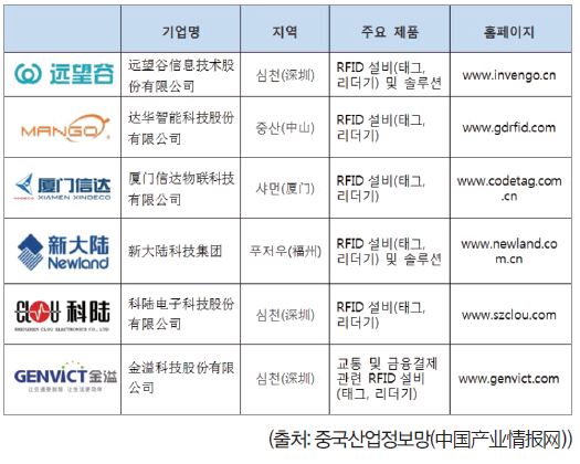 중국은 현재 RFID 제조사가 100개 이상 있으며, LF(저고주파) RFID기술이 성숙돼 가장 많이 활용되고 있으나 UHF(초고주파) RFID 핵심기술이 취약하고 제조사도 적은 편이다.