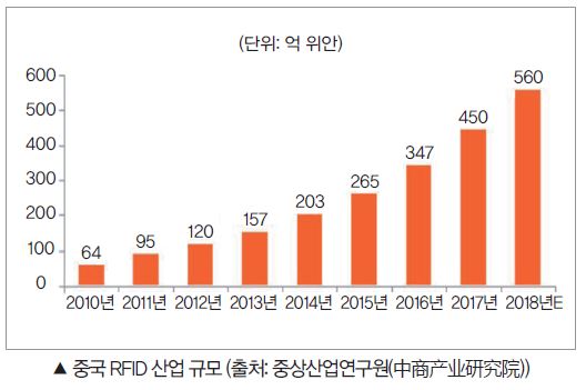 중상산업연구원(中商产业研究院, 중국 시장조사 및 분석기관)에서 발표한 ‘2017~2022년 중국 사물인터넷 시장전망 투자기회 보고’에 따르면, 2010~2016년 중국 RFID 설비 시장 연평균 성장률은 32.5%에 달했다. 2017년에는 450억 위안에 육박했고 2018년에는 560억 위안에 달할 전망이다. 이와 같은 발전속도로 2022년은 730억 위안 이상의 규모에 이를 것으로 전문가들은 전망하고 있다.