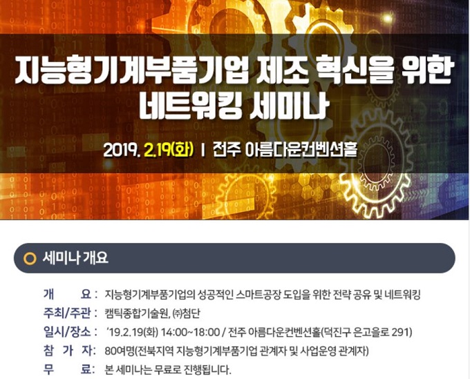 캠틱종합기술원과 첨단이 오는 19일 전주 아름다운컨벤션홀에서 지능형기계부품기업의 성공적인 스마트공장 도입을 위한 전략 공유 및 네트워킹이라는 주제로 '지능형 기계부품기업 제조 혁신(스마트공장) 세미나'를 개최한다.