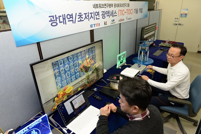 ▲ ETRI 연구진이 광대역 기술 시험을 위해 무압축 동영상 전송을 진행하고 있는 모습이다.