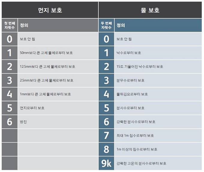 IP(Ingress Protection)는 ISO(국제 표준화 기구)가 IEC 60529에 따라 개발한 국제 등급 체계로서 먼지와 액체로부터 산업용 장비의 보호 수준을 나타내는 데 쓰인다. IP 등급은 2개의 숫자로 구성된다. 첫 번째 숫자는 고체 물체와 먼지에 대한 보호 수준을 의미하고 두 번째 숫자는 세척 과정에서 쓰이는 것과 같은 액체에 대한 보호 수준을 나타낸다. 예를 들어 IP65 등급인 코더는 먼지, 낮은 압력의 물 분사로부터 완벽히 보호된다. 아래 표에서 서로 다른 등급에 대한 설명을 하고 있다.