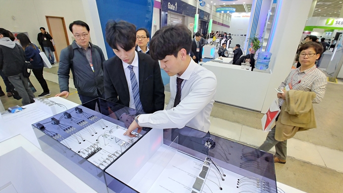 ▲ 에프에이시스템의 정지원 대리가 스마트공장·자동화산업전 참관객에게 진공용 특수 광화이버센서에 대해 설명하고 있다.