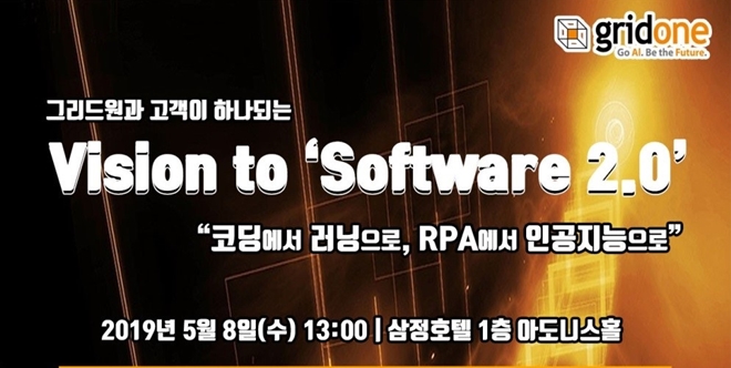 국내 최다 RPA 레퍼런스를 보유한 인공지능 전문 솔루션 기업 그리드원이 다음달 8일 삼정호텔에서 Vision to 'Software 2.0'(코딩에서 러닝으로, RPA에서 인공지능으로) 세미나를 개최한다고 밝혔다.