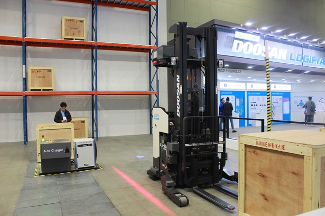 제1전시장 1홀 뒤편, 넓은 부스를 차지한 두산 로지피아는 전시회를 찾은 참관객에게 다양한 볼거리를 제공했다. 참관객의 시선을 가장 먼저 사로잡은 장비는 무인지게차 'AGV'의 시연이었다. AGV는 사람의 도움 없이 스스로 물류작업을 수행함으로써 근로환경 변화에 유연하고 효율적으로 대응할 수 있는 장비다.