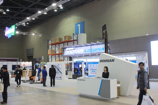 4차산업혁명의 최신기술이 반영된 물류산업의 미래를 가늠할 '국제물류산업대전 2019(KOREA MAT 2019)'가 지난 16일 일산 킨텍스에서 개최됐다. 두산 로지피아는 이번 물류산업대전에서 자사의 지게차와 무인지게차, 파워팔레트 트럭, 두산의 TMS인 'Lin-Q'서비스를 선보였다.