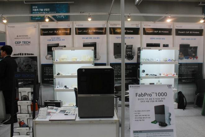 자동차 기술산업전 '오토모티브 테크놀로지 엑스포 2019( (AUTOMOTIVE TECHNOLOGY EXPO 2019, 이하 오토테크엑스포)'가 23일인 오늘 수원 컨벤션센터에서 개최됐다. 이번 전시회에 참가한 씨이피테크는 3D시스템즈의 MJP 3D프린터 'ProJet 2500W'와 엔트리 레벨 산업용 3D프린터인 'FabPro™1000', 장비로 제작된 시제품 등을 소개했다.