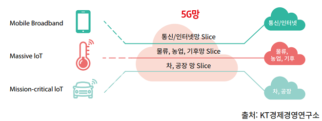 5G는 네트워크 슬라이싱(Slicing) 기술을 통해 하나의 5G 통신망으로 여러 방식의 네트워크를 구현할 수 있다. 5G 슬라이싱은 ①일반 통신/인터넷은 모바일 브로드밴드 ②물류, 농업, 기후망 등은 매시브 IoT ③스마트팩토리, 자율주행, 로봇 컨트롤 등을 크리티컬 IoT로 구분된다. 특히 크리티컬 IoT 네트워크에서는 리스펀스 타임이 1ms까지 구현된다.