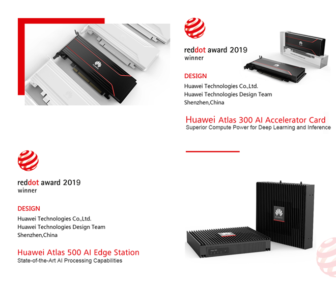 화웨이 Atlas 300 AI Accelerator Card와 Atlas 500 AI Edge Station은 혁신적인 디자인을 인정받아 제품 디자인 부문의 아카데미상이라 불리는 레드닷 디자인상을 받았다. 우수한 지능과 성능을 부각시키는 Atlas는 미학과 기능성을 떨어뜨리지 않으면서 열을 발산한다.