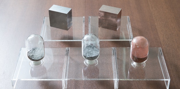 ▲메탈 하이브리드 방열소재 시제품 2종(좌측 상단부터 시계 방향으로 Al계, Cu계)과 분말 3종(Cu계, Al계, Ag계).