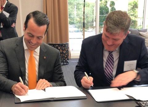 ▲신타비아 CEO 브라이언 네프와 하우코그룹 수석부사장 데이비드 프레스턴이 합작법인 설립에 동의했다.