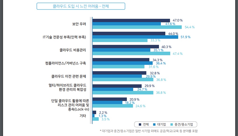 눈에 띄는 점은 클라우드 도입 시 겪는 가장 큰 어려움으로 보안에 대한 우려가 47%의 응답을 하면서 가장 크고, 다음으로 전문 인력의 부족(44%)과 비용관리 어려움(40.3%)으로 응답해 클라우드 도입 시 보안에 관한 고민이 가장 크다고 인식한다는 점이다.