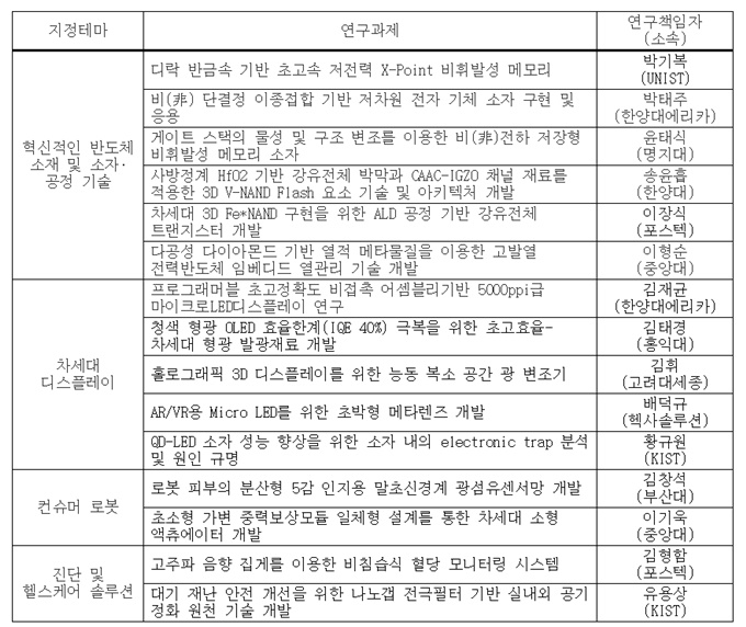 반도체 산업의 획기적인 기술 향상을 이끌 기술을 공모한 '혁신적인 반도체 소재 및 소자∙공정 기술' 분야에서는 △ 이온 이동을 이용한 차세대 메모리 반도체 (명지대학교 윤태식 교수), △ 낸드플래시 메모리를 100층 이상 집적하기 위한 신규 소재 (한양대학교 송윤흡 교수), △ 다이아몬드 이용한 차세대 반도체 패키징 기술 개발 (중앙대학교 이형순 교수) 등 반도체 소자 구조와 소재를 획기적으로 차별화할 수 있는 과제 6개가 선정됐다.