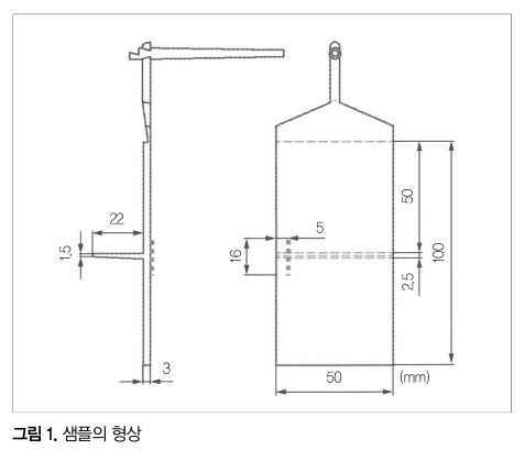 이번 연구에 사용한 성형품을 그림 1에 나타냈다. 성형품은 길이 100mm, 폭 50mm, 두께 3mm의 평판 중앙부에 높이 22mm, 두께 1.5mm의 리브를 가지는 형상이다.