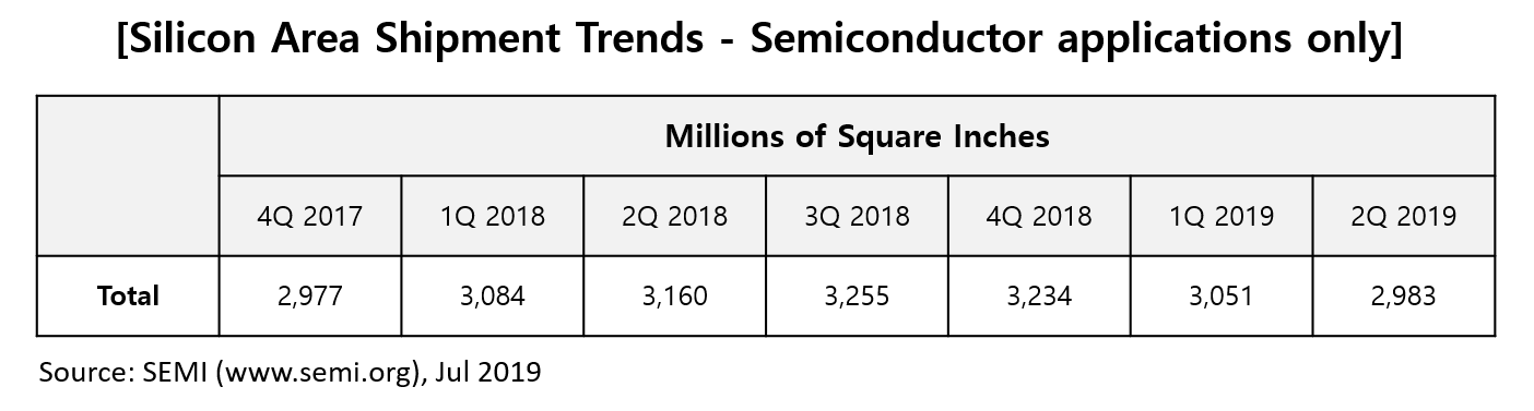 전자 제조 공급망 시장을 대표하는 글로벌 산업 협회인 SEMI에 따르면, 2019년 2분기 전세계 실리콘 웨이퍼 출하량은 29억8300만 제곱인치로 1분기 30억 5100만 제곱인치 대비 2.2% 하락하였다고 24일 밝혔다. 이는 전년 동기인 31억 6000만 제곱인치 대비 5.6% 하락한 수치이다.
