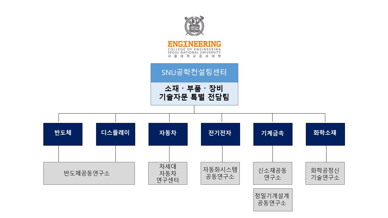 서울대학교 공과대학은 공과대학 산학기술협력 조직인 SNU공학컨설팅센터에 소재, 부품, 장비 기술자문 특별 전담팀(TF)을 구성하기로 했다고 7일 밝혔다. 산업별로 반도체, 디스플레이, 자동차, 전기전자, 기계금속, 화학소재의 분야를 서울대 공대 소속의 반도체공동연구소, 차세대 자동차 연구센터, 자동화시스템공동연구소, 신소재공동연구소, 정밀기계설계공동연구소, 화학공정신기술연구소의 대규모 연구소들이 각각 기술자문을 지원한다.
