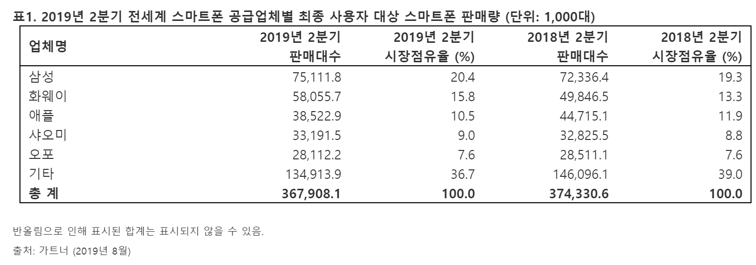 세계적인 IT 자문기관 가트너(Gartner)가 2019년 2분기 전세계 스마트폰 판매량을 29일 발표했다.