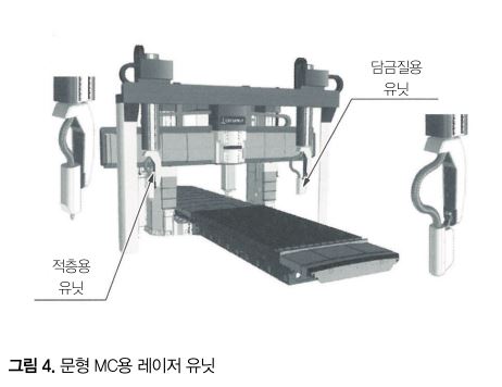 이 기계 전면에 담금질용 및 적층용 유닛을 탑재함으로써 금형을 바꿔 싣는 일 없이 레이저 담금질에 의한 열처리, 적층에 의한 패딩 수정이 가능하다(그림 4). 가공과 열처리 및 패딩 수정 공정을 문형 MC 1대로 집약함으로써 세팅 작업과 다음 공정의 대기 시간 단축이 가능하고, 생산성의 대폭 향상을 기대할 수 있다.