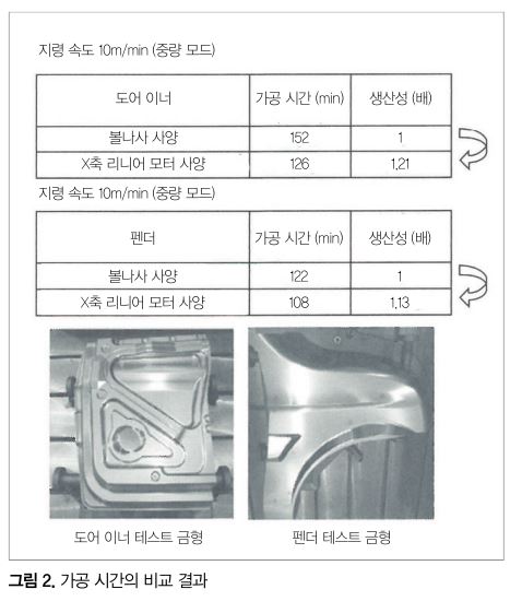 그림 2에 동사 테스트 금형의 가공 시간 비교 결과를 나타냈다. 고추력의 리니어 모터 채용에 의해 급이송 속도․절삭 이송 속도․가속도 모두 기존기보다 향상, 최대 21%의 생산성 형상을 달성할 수 있었다.