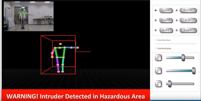 작업자가 위험하거나 접근이 금지된 곳에 진입하는 것을 3D camera로 인식하여 구동중인 장비 또는 로봇에 신호를 보내서 구동중인 장비나 로봇의 속도를 느리게 하거나 긴급한 상황일 경우 멈추라는 신호를 보내주는 시스템이다. 대부분의 업체에서 자동화 장비 주변에 센서를 장착하여 사고를 예방을 하고 있지만 안전사고가 줄어들지 않고 있어서 센서만으로는 방지하기 어려운 안전사고를 줄이기 위해 AI 기술을 활용하여 작업자의 안전 환경 수준을 강화할 수 있다.