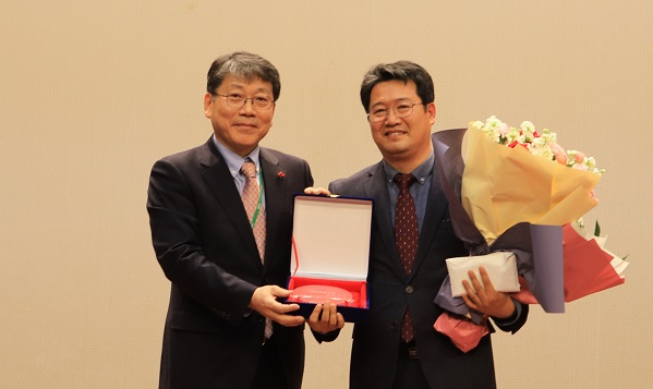 ▲한국기계연구원 박천홍 원장(왼쪽)과 이창우 책임연구원(오른쪽)이 2019년 12월 16일 열린 제43회 창립기념식에서 최우수연구상 시상식을 갖고 기념사진을 찍고있다.