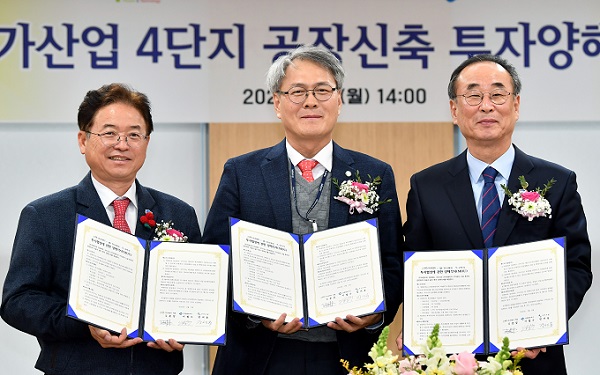 ▲왼쪽부터 김준섭 피엔티 대표, 이철우 경상북도지사, 장세용 구미시장