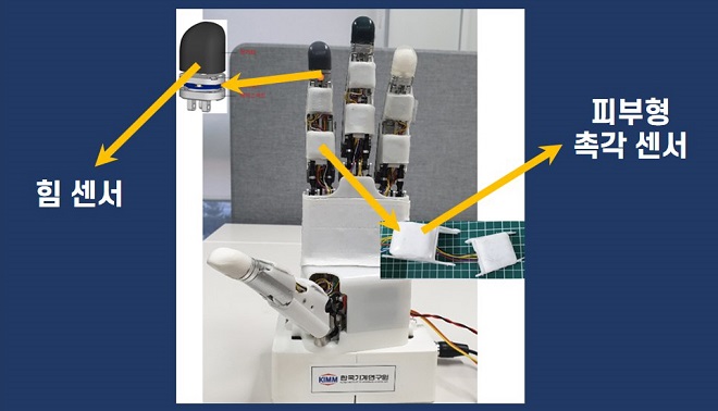 연구팀은 물체와 접촉을 감지할 수 있는 촉각 기능을 부여하기 위해 힘 측정 센서를 개발하고 손가락 끝과 마디, 손바닥에 장착했다. 손가락 끝에 장착된 힘 센서는 지름 15㎜, 무게 5g 이하의 초소형 센서로, 로봇 손과 물체가 접촉할 때 손가락 끝에서 감지되는 힘의 크기와 방향을 측정할 수 있다. 물건을 쥐는 힘을 조절하는 핵심이다.