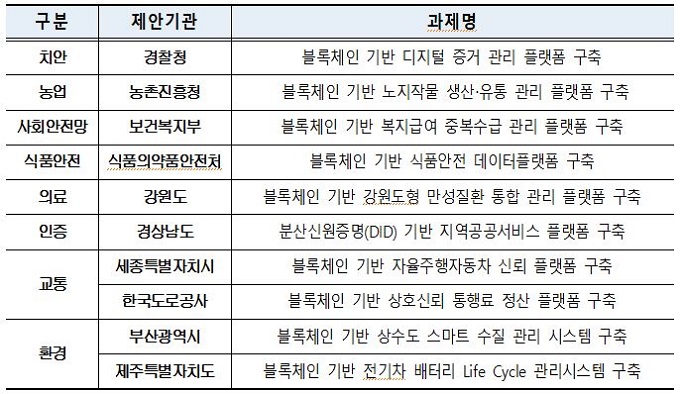 우선 공공선도 시범사업은 블록체인 기술을 공공부문에 선도적으로 도입․적용하여 공공서비스를 혁신하고 블록체인 초기시장을 창출하기 위한 것으로 총 70억 원 규모로 10개 과제를 추진한다.