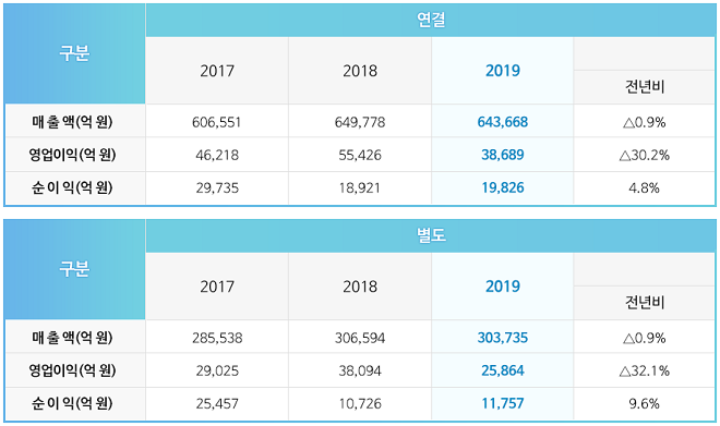 포스코가 2019년 연결 기준 매출액 64조3668억원, 영업이익 3조8689억원, 순이익 1조9826억원을 기록했다. 매출은 전년 대비 0.9% 감소했으나 영업이익은 전년 대비 30.2% 감소했으며, 영업이익률은 6.0%를 기록했다.