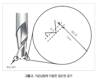 이번 연구는 가공 이상의 예로서 공구 결손의 검출에 대응했다. 그림 2와 같이 절삭날 2개 중 1개의 끝단에 폭 1mm의 결손을 고의로 설정한 공구로, 4가지 절삭 조건으로 가공실험을 했다.