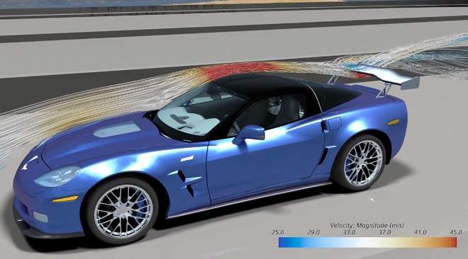 ▲지멘스의 솔버 제어 기능이 적용된 ‘심센터 STAR-CCM+’를 통한 쉐보레 콜벳의 기체이동 시뮬레이션 화면