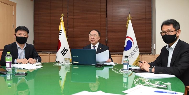 ▲홍남기 부총리 겸 기획재정부 장관이 국제통화금융위원회(IMFC)를 화상회의로 참여하고 있다.