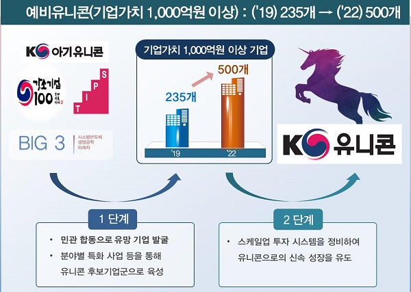 이상 1단계 프로그램을 통해서는 기업가치가 1000억원이 넘는 예비유니콘을 2022년까지 500개로 늘려 2019년(235개) 대비 2배 이상 확대할 계획이다.