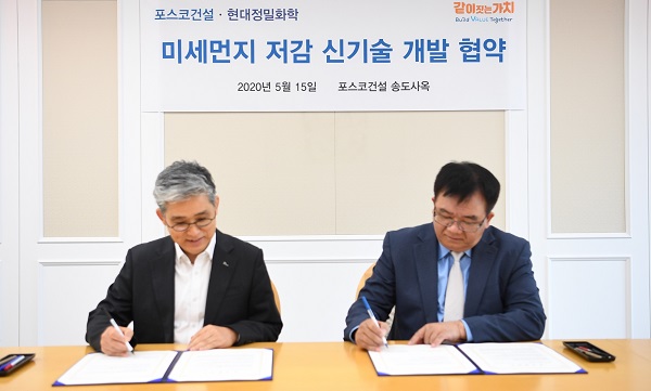 현대정밀화학과 포스코건설이 5월 15일 `미세먼지 저감 신기술 개발` 협력을 위한 양해각서를 체결하고 건설 현장의 비산 먼지를 줄이는 기술을 공동 개발하기로 했다.