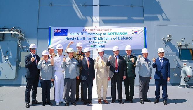 ▲6월 10일 현대중공업 울산 본사에서 뉴질랜드로 출항하는 최신예 군수지원함 ‘아오테아로아’함