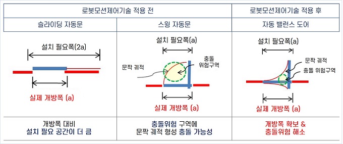 연구팀은 여닫이 문에 모션 제어기를 부착해 밸런스 도어로 바꾸고, 사람의 움직임을 감지해 최소한의 공간에서 자동으로 열고 닫을 수 있게 만들었다. 모션 제어기에는 사람과 로봇의 안전한 협동 작업을 구현하기 위한 충돌감지 및 대응 알고리즘이 적용됐다.