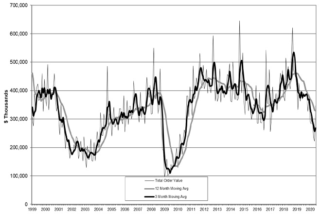 ▼ 2020년 6월 미국 공작기계 수주 현황 (Total U.S. Manufacturing Technology Orders Through June 2020)
