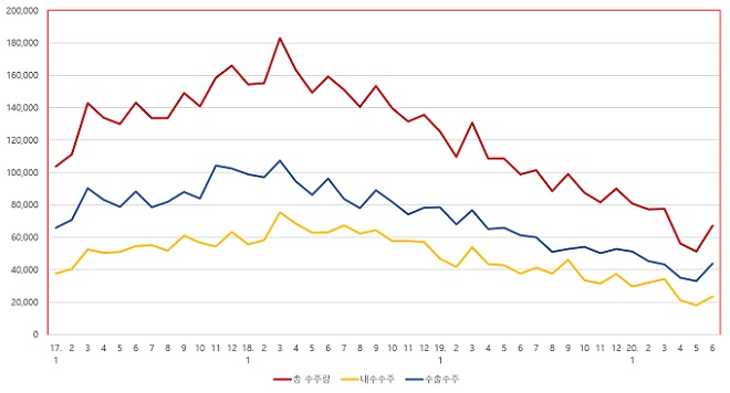 6월 수주량은 500억엔대 하락세를 회복했지만, 매년 6월 기준으로 보면 11년(2009년 350억엔)만에 처음으로 700억엔대 아래로 떨어진 수치다.