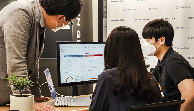 ▲베스핀글로벌 직원들이 클라우드 이상 비용 탐지 솔루션 화면에서 데이터를 분석하고 있다.