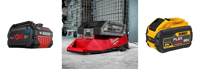 ▲(왼쪽부터) 보쉬 리튬이온 배터리 ‘프로코어(ProCORE)’, 밀워키 ‘MX FUEL’ 배터리팩 ‘XC406’과 충전기, 디월트 가변전압 배터리 ‘플렉스볼트’