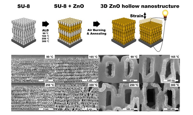홍 교수 연구팀은 문제해결을 위해 근접장 나노 패터닝(PnP) 기술 및 원자층 증착(ALD) 기술을 이용해 3차원 나노 트러스 구조를 갖는 산화물 아연 세라믹을 제작했다. 또 나노 인덴테이션 기술과 압전 감응 힘 현미경(PFM) 기술을 이용, 제작된 구조체의 높은 기계적 특성과 압전 특성을 입증하는 데 성공했다.