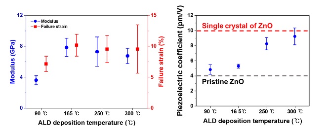 이 아연 산화물 트러스 구조체의 탄성 변형률은 10% 수준으로 기존 아연 산화물 대비 3배나 더 큰 것으로 나타났으며 압전 계수 역시 9.2 pm/V로 박막 형태의 아연 산화물보다 2배 이상 더 큰 값을 나타냈다.