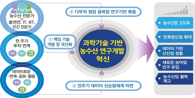 이번 전략은 농수산업의 새로운 성장동력을 창출하고 농어촌 지역경제 균형 발전의 계기를 만들기 위한 것으로 ▲핵심기술 개발 및 소재ㆍ부품ㆍ장비 국산화 ▲다부처 협업 융복합 연구기반 확충 ▲전주기 데이터 선순환체계 마련이라는 세 가지 항목이 제시됐다.