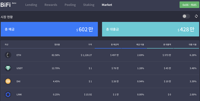 현재 서비스 론칭 후 5일 만에 예금 및 대출금 규모는 총 1천만 달러(한화 약 109억7500만 원)를 넘어섰다. 바이파이의 예금, 대출 서비스는 현재 이더리움(ETH), 테더(USDT), 체인링크(LINK), 다이(DAI) 등 이더리움 기반의 4개 ERC-20 토큰으로 이용 가능하며, 추후 보다 많은 토큰이 추가될 예정이다.