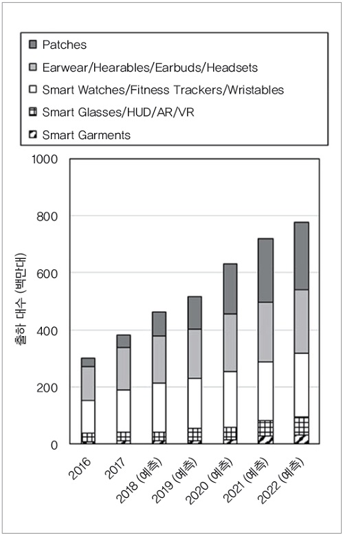 그림 4는 유럽과 미국의 ‘Wearable Technologies’ 기관이 발표한 웨어러블 센서형별 세계의 출하 대수이다. 이 조사에서는 2020년 이후도 예측되어 있으며, 앞으로도 웨어러블 센서의 출하 대수는 증가할 것으로 전망하고 있다. 형태별로 보면 스마트워치와 리스트밴드 타입형과 보청기를 포함한 귀 장착형 센서의 출하 대수는 최근 몇 년의 기세가 다소 정체될 것으로 전망된다.