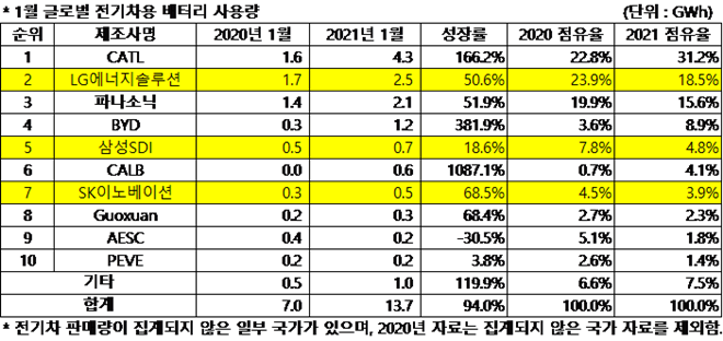 SNE리서치가 2021년 1월 판매된 글로벌 전기차 탑재 배터리 사용량 순위를 발표했다.