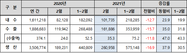 2월 생산은 설연휴로 인한 공장 가동일수 감소(20일→17일)에도 불구하고 전년 2월 코로나19로 인한 공장생산 차질에 따른 기저효과 및 내수・수출 동반 증가 등으로 전년 동월 대비 37.9% 증가한 26만958대를 기록했다.