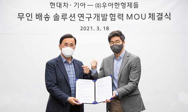 현대차·기아는 18일 우아한형제들과 현대차·기아 남양연구소에서 ‘배송 로보틱 모빌리티 및 물류 분야 연구개발’을 위한 업무협약(MOU)을 맺었다고 19일 밝혔다.