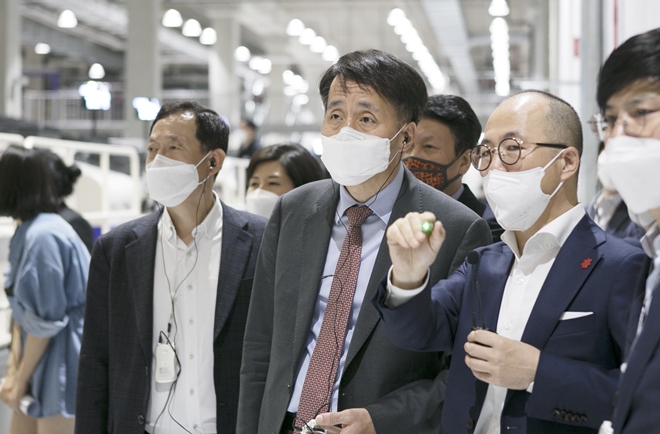 ▲장영진 산업통상자원부 산업혁신성장실장이 지난 2일 경기도 김포시에 위치한 SSG닷컴 네오물류센터를 방문해, 주요 시설을 둘러보고 있다. (출처 : 산업부)