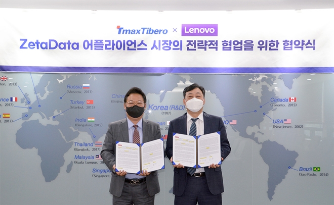 티맥스티베로는 레노버 인프라스트럭처 솔루션그룹 코리아와 ‘제타데이터 어플라이언스 시장의 전략적 협업을 위한 협약식’을 체결해 티맥스 DB와 레노버 하드웨어를 결합시킬 예정이라고 19일 밝혔다.