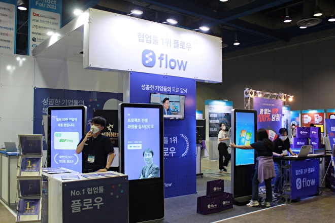 전시장 전면에 배치된 기업 중 하나인 마드라스체크는 자사가 개발한 협업툴인 '플로우'를 소개했다. 지난 2016년 출시된 플로우는 매년 300% 넘는 성장률로 현재 20만 명의 사용자를 확보한 협업 소프트웨어다.
